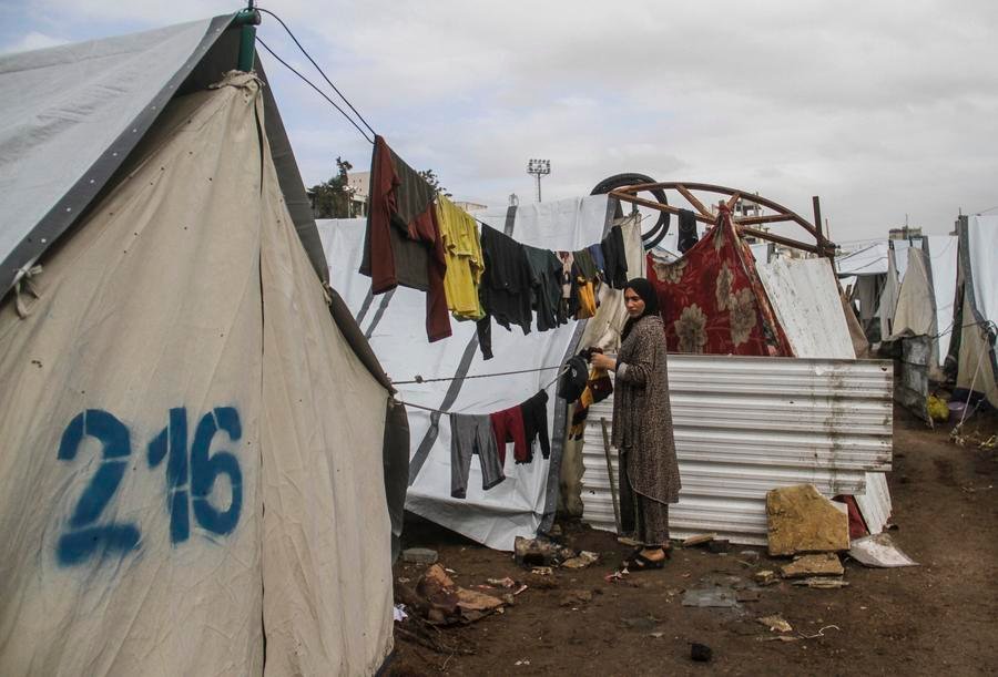 (241125) -- GAZA CITY, Nov. 25, 2024 (Xinhua) -- A Palestinian is seen among tents for displaced people in the Al-Yarmouk stadium in Gaza City, on Nov. 24, 2024. The Civil Defense in the Gaza Strip warned on Sunday of a "humanitarian disaster" due to rainwater, which could cause flooding and damage to the tents of displaced people. (Photo by Mahmoud Zaki/Xinhua)
