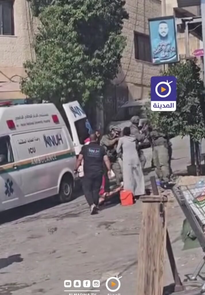 واعتدى جندي الاحتلال على امرأة بالضرب أثناء محاولة سيارة الإسعاف من نقل المصاب، وقامو باحتجازه