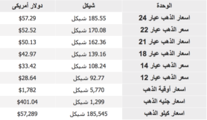 وبحسب التقرير اليومي لأسعار الذهب، فإن قيمة عيار 24 وصلت إلى 185.55 شيكل، بما يعادل 57.29 دولارًا أمريكيًا، فيما بلغ سعر عيار 22، 170.08 شيكلًا، أيّ ما يعادل 52.52 دولار أمريكي.