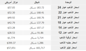 وبحسب التقرير اليومي لأسعار الذهب، فإن قيمة عيار 24 وصلت إلى 183.72 شيكل، بما يعادل 57.05 دولارًا أمريكيًا، فيما بلغ سعر عيار 22، 168.41 شيكلًا، أيّ ما يعادل 52.30 دولار أمريكي.