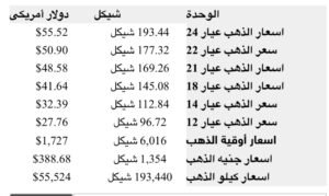 وبلغت قيمة عيار الـ21 إلى 169.26 شيكلا، بما يعادل 48.58 دولارًا أمريكيًا، فيما بلغ سعر عيار 22، 177.32 شيكلًا، أيّ ما يعادل 50.90 دولارا أمريكيا.