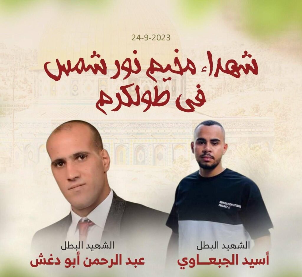 وأعلنت وزارة الصحة الفلسطينية، استشهاد الشابين أُسيد جبعاوي (21 عامًا)، وعبد الرحمن أبو دغش (32 عامًا) متأثرين بإصابتهما برصاص الاحتلال بمخيم نور شمس شرق طولكرم.