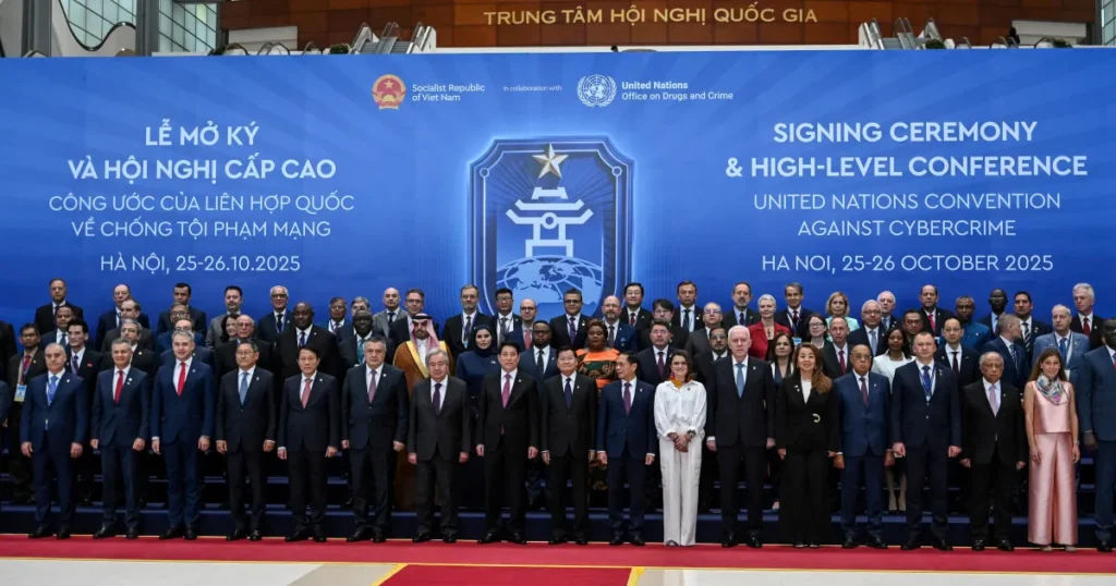 وقّعت دولة فلسطين اليوم السبت، على اتفاقية الأمم المتحدة لمكافحة الجرائم الإلكترونية، وذلك خلال الحفل الرسمي الذي استضافته العاصمة الفيتنامية هانوي، بحضور رئيس جمهورية فيتنام الاشتراكية لوونج كوونج، والأمين العام للأمم المتحدة أنطونيو غوتيريش، وعدد كبير من رؤساء الوفود، وممثلي الدول، والمنظمات الدولية.