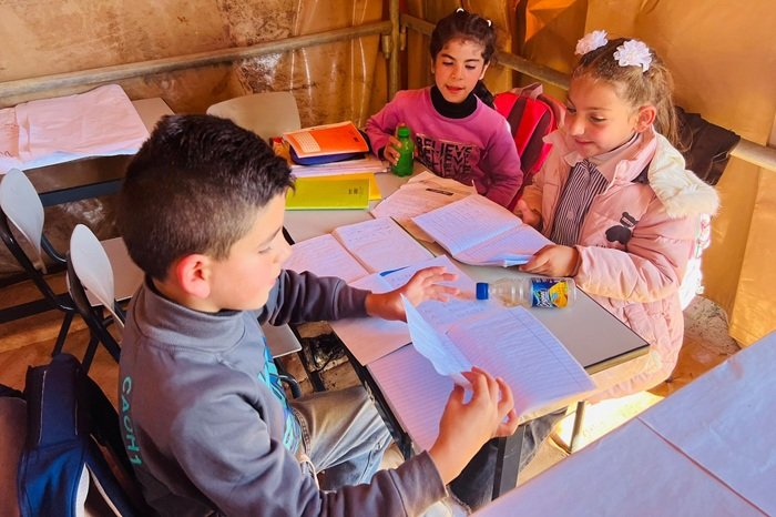 عند مدخل الخيمة التي أُقيمت من واقع الحاجة، تجلس معلمة برفقة بضعة طلبة من الصف الثاني الابتدائي تتابع واجباتهم في درس الرياضيات، وخلف ستار في الخيمة ذاتها تقف معلمة أخرى تشرح درس اللغة العربية للصف الرابع الأساسي.