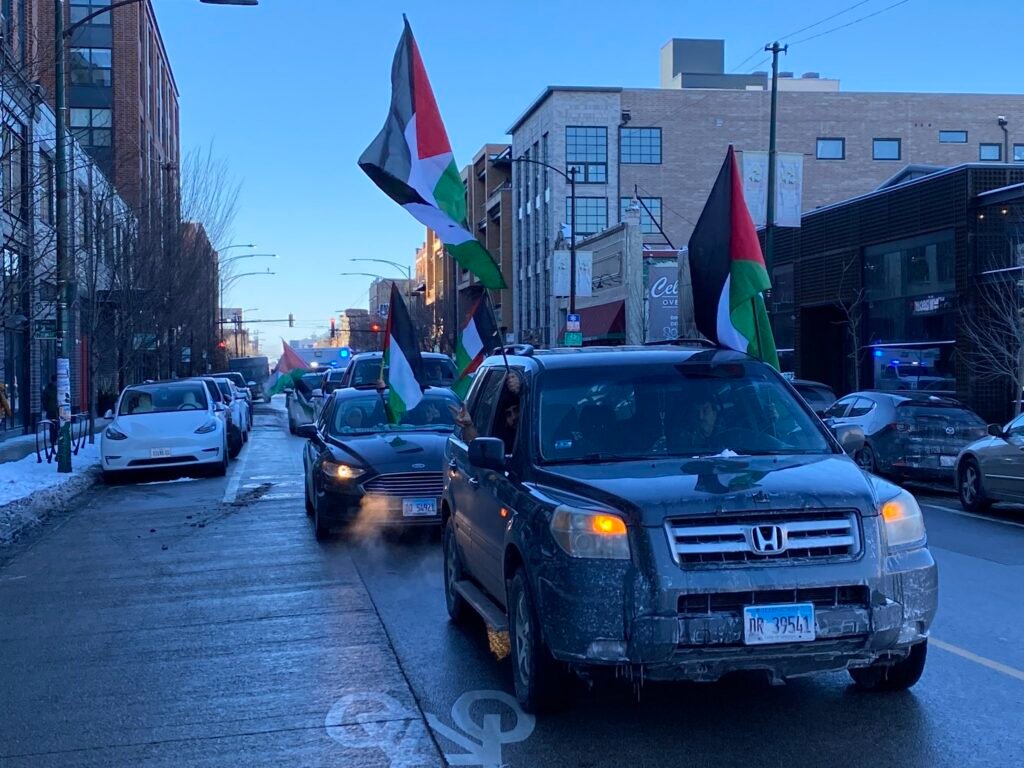 وسارت المركبات في شوارع مدن نيويورك، وشيكاغو، والعاصمة واشنطن، وهي تحمل الأعلام الفلسطينية واللافتات المطالبة بوقف العدوان.