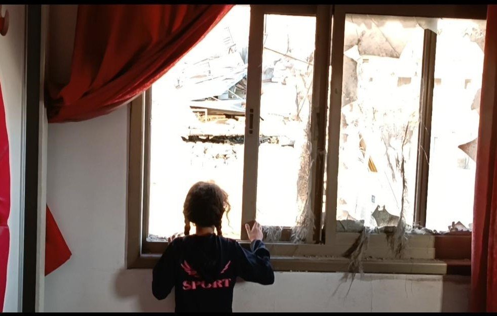 وقفت الطفلة لمار خرّوشة (8 سنوات)، من مخيم عسكر شرق نابلس، على نافذة منزلها تراقب الركام وآثار الدمار الذي خلفه تفجير قوات الاحتلال لأحد المنازل المجاورة.