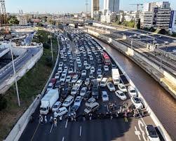 وأظهرت مقاطع فيديو من الطريق السريع جنوب تل ابيب، متظاهرين يرفعون لافتة كبيرة كتب عليها “كفى لحكومة الدمار” لإغلاق الطريق، ومنعوا المركبات من التقدم في وقت الذروة.