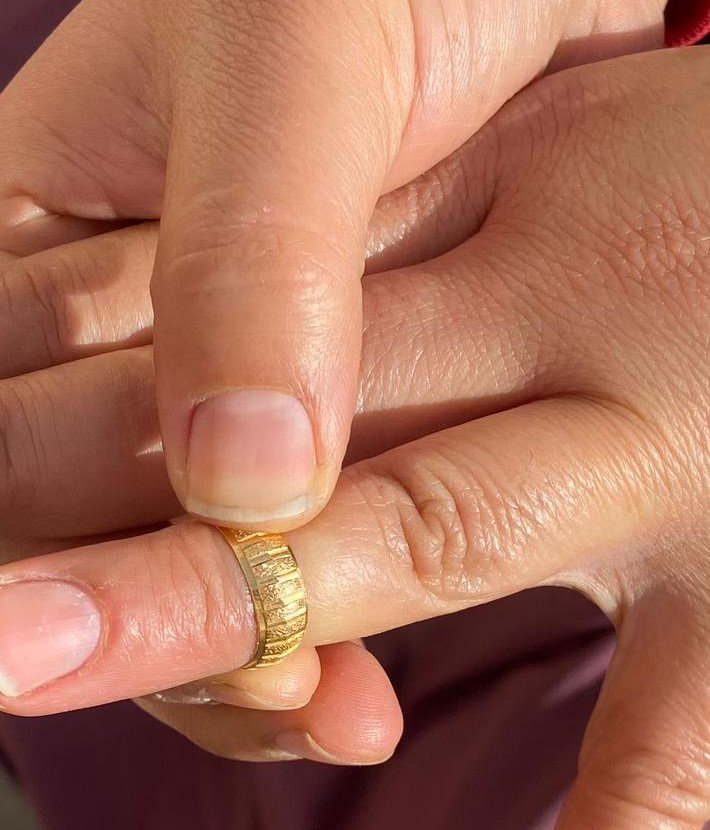 امرأة أخرى وصلت في عجالة، لم تسأل عن سعر الذهب، وضعت خاتما أمام البائع وقالت: “كم ثمنه”.