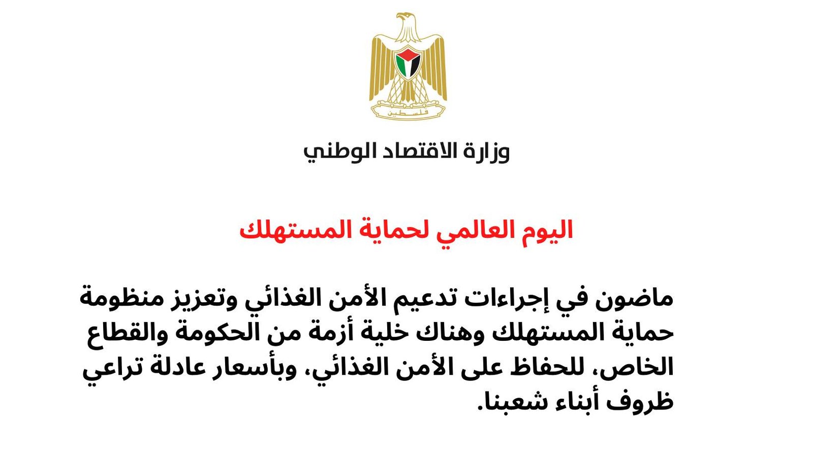 وزارة الإقتصاد وبمناسبة اليوم العالمي لحماية المستهلك، تؤكد على حق المستهلك بالحصول على سلعة آمنة ونظيفة وبأسعار عادلة