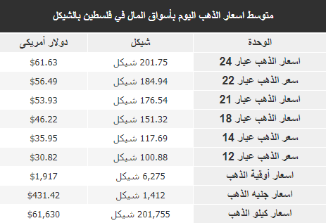 ووصلت قيمة عيار الـ24 إلى 201.75 شيكل، بما يعادل 61.63 دولارًا أمريكيًا، فيما بلغ سعر عيار 22، 184.94 شيكلًا، أيّ ما يعادل 56.49 دولار أمريكي.