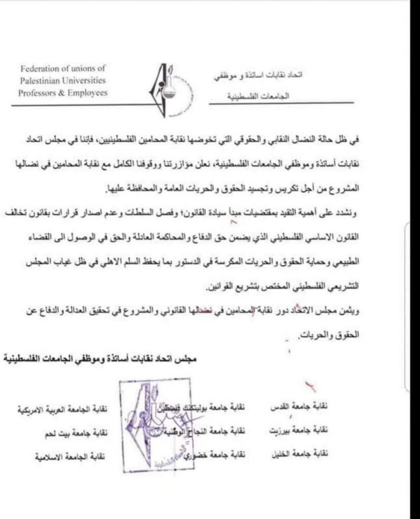 أعلن مجلس اتحاد نقابات أساتذة وموظفي الجامعات الفلسطينية، في بيان له اليوم الاربعاء مساندة الاتحاد لنقابة المحاميين الفلسطيينيين في مطالبتها بتعديل عدد من القوانين.